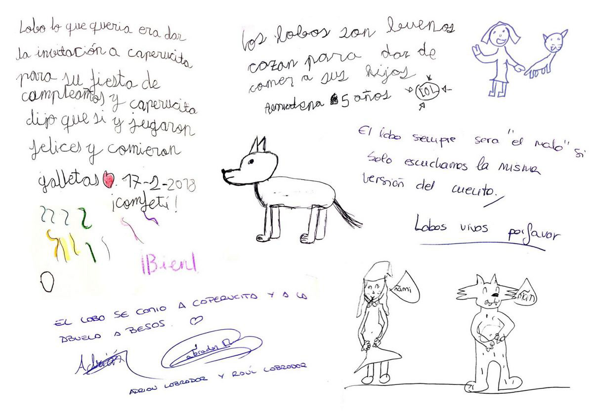 Detalle del libro de visitas donde los niños escriben otra versión del cuento.